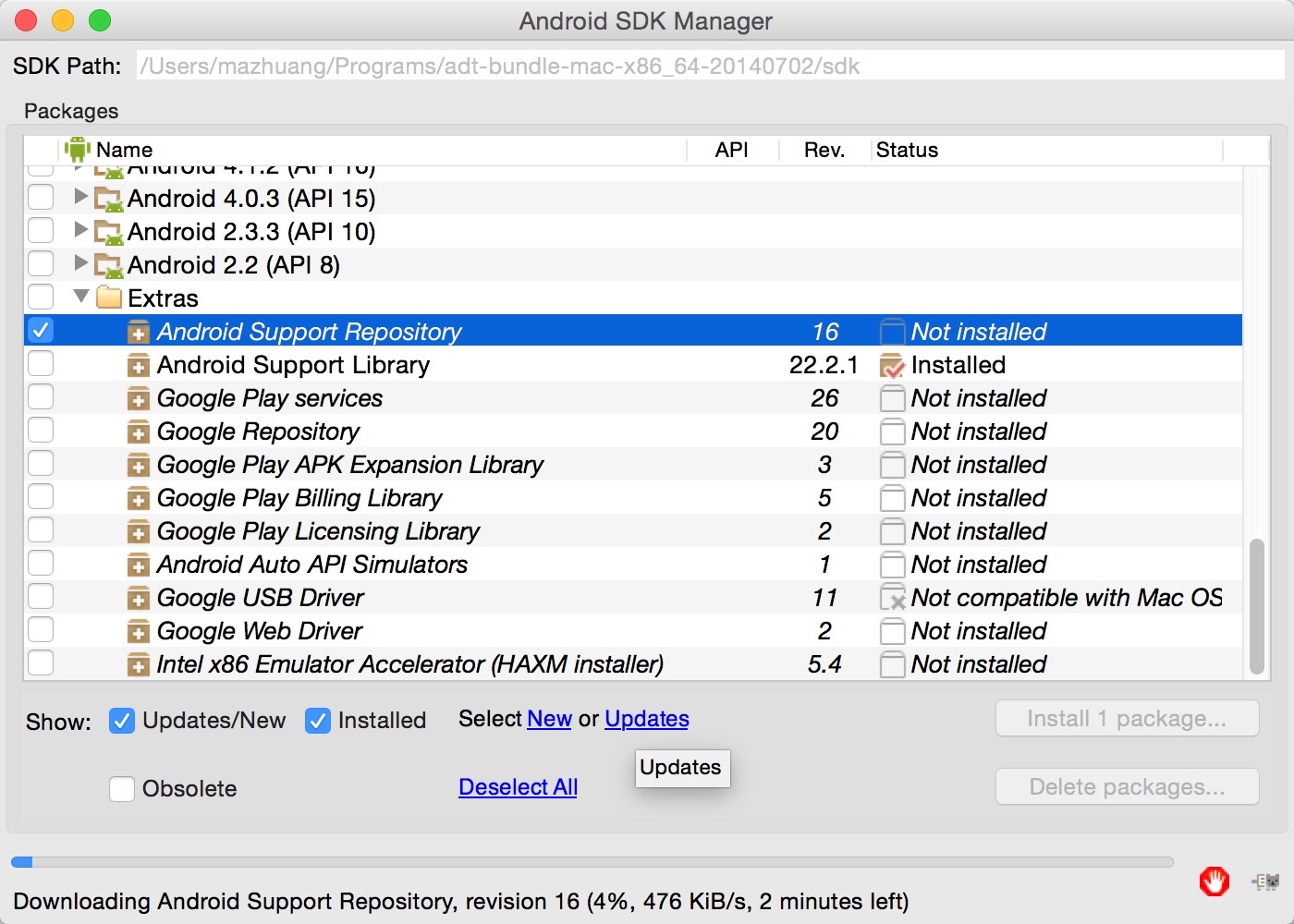 1. 打开 SDK Manager,然后安装 Extras 下的 Android Support Repository: